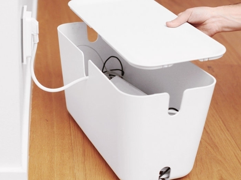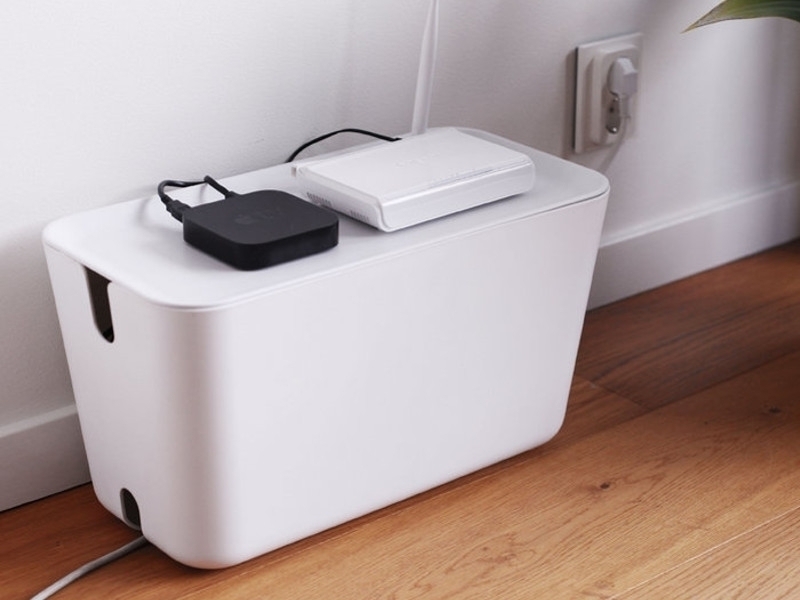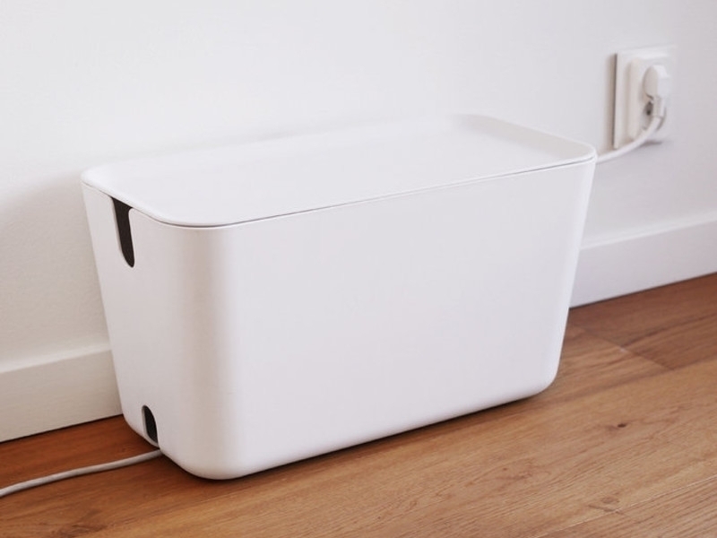 Der Bosign Kabelbox XXL in weiß ist mit durchdachten Details, wie z.B. einem großen abgesenkten Deckel ausgestattet, der das sichere Ablegen von Tablets oder Smartphones ermöglicht. Die Silikonfüße sorgen für Stabilität der Box und vermeiden Kratzer auf Böden, Regalen und Tischen. In dem Boden der Kabel Box sind größere Öffnungen zur Belüftung der Geräte und zur Durchführung der Stecker.