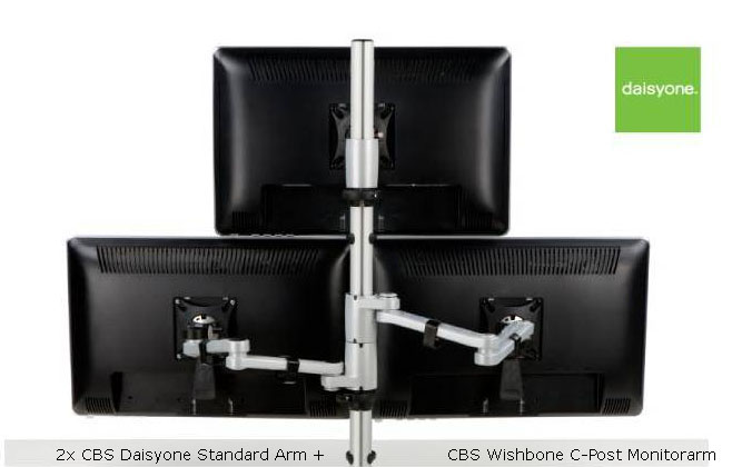 Der CBS Daisyone Monitorarm (COM/001/S) in silber ist mit dem traditionellen Adaptersystem von CBS vielfältig kompatibel und erlaubt universelle Single- sowie Mehrfachanordnungen von Flachbild-Fernsehern. Für eine vollständige Halterung wird zusätzlich eine CBS Tischbefestigungssäule sowie eine Tischbefestigung benötigt.