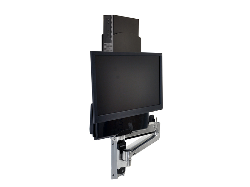 Mit mittelgroßem, silberfarbenem CPU-Halter. Dies ist ein komplettes System, das Platz für ein Monitor, eine Tastatur und eine CPU bietet und eine vertikale sowie seitliche Ausrichtung erlaubt. Die perfekte Lösung für räumlich begrenzte Arbeitsbereiche: Klappen Sie Tastatur und Display einfach nah an die Wand, wenn diese nicht benutzt werden.