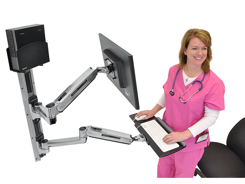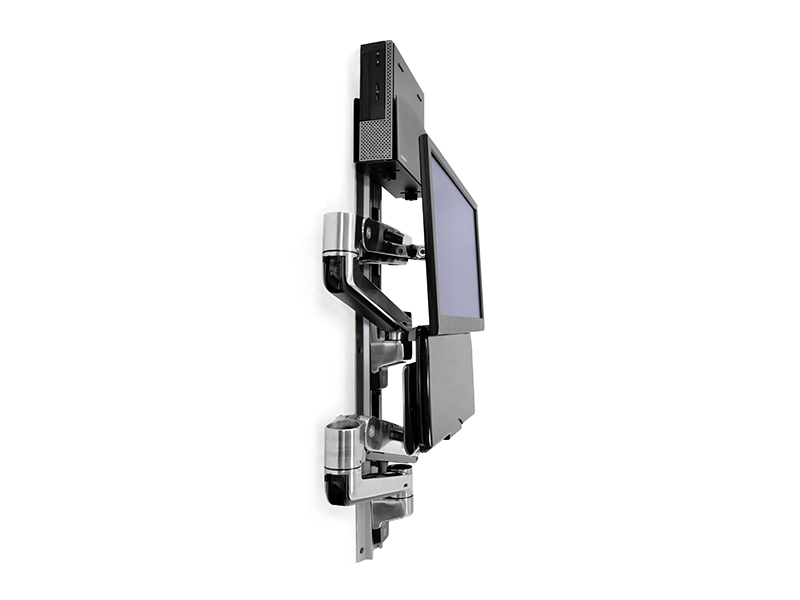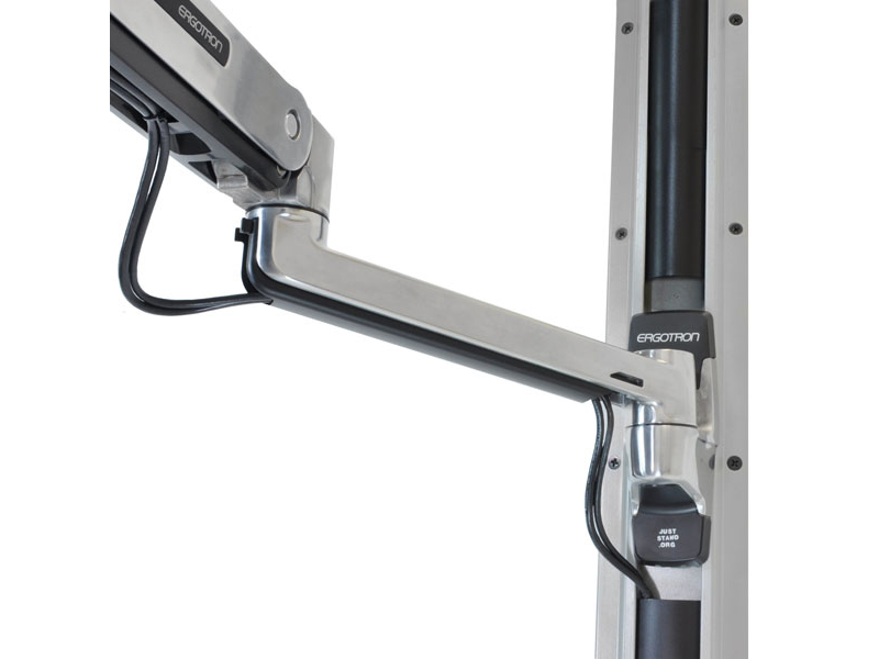 - Gelenkarme können rundum geneigt/geschwenkt und vertikal um 51 cm verstellt werden, sodass der Benutzer im Sitzen oder Stehen am Computer arbeiten kann.