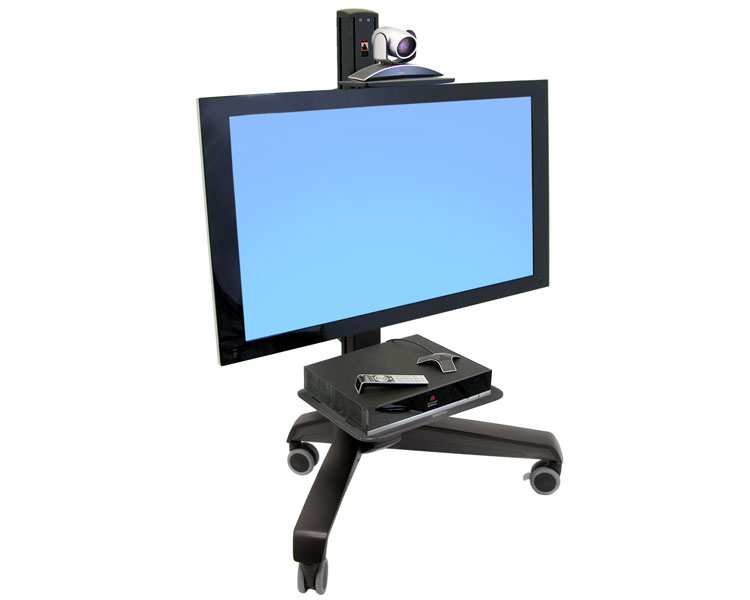 Verwenden Sie das MMC Kameraregal, um eine verstellbare Videokonferenzkamera über jedem Ergotron Neo-Flex Mobile MediaCenterDisplay anzubringen.