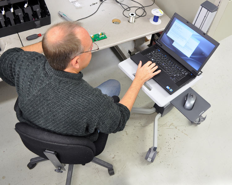 Der Ergotron Neo-Flex Laptop-Wagen (24-205-214) ist ein ergonomischer und mobiler Arbeitsplatz, der sich für den Einsatz in Fertigungsanlagen, Kliniken, Laboratorien oder Vertriebszentren eignet. Mit einem Handgriff lässt sich die Höhe an die ergonomischen Bedürfnisse des Nutzers anpassen. Der mobile Notebookwagen kann als Steh- und als Sitzarbeitsplatz genutzt werden und wurde für Laptops bis 17 Zoll optimiert. Durch einen Bügel wird das Notebook vor dem Herunterfallen geschützt. Die Verwendung von zusätzlichen Haftmitteln oder Klettverschlüssen zur Sicherung des Notebooks ist nicht nötig. Der Laptopwagen hat eine leicht zu reinigende Oberfläche aus Aluminium, hochwertigem Kunststoff und pulverbeschichtetem, lackiertem Stahl. Dank des leichten Designs kann der Neo-Flex Laptopwagen anhand eines Griffes an der vorderen Arbeitsfläche problemlos in engen Räumen manövriert werden.