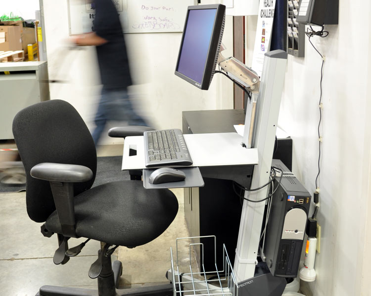 - Monitor-Monitor und Tastatur sind für den besseren Zugriff seitlich schwenkbar; für Bediener mit Gleitsichtbrille oder Bediener, die einen Tablet-PC benutzen, reicht der Arm tief nach unten.