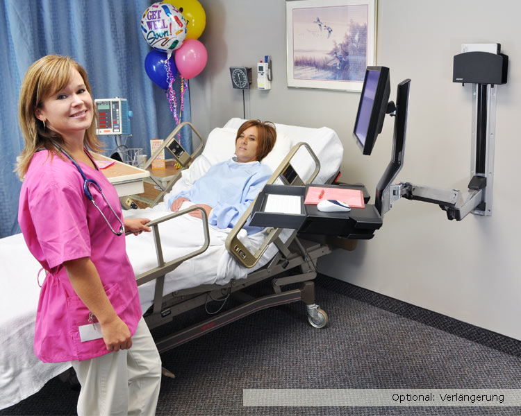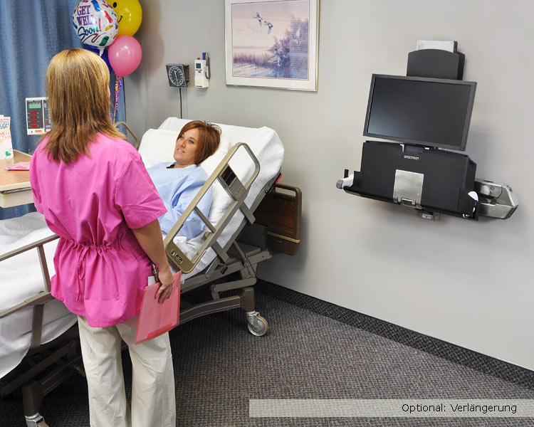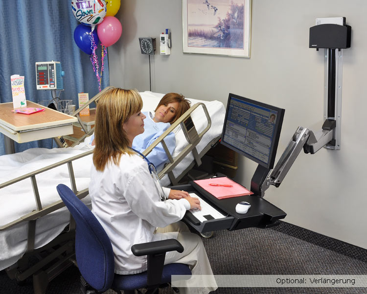Beständige Konstruktion aus poliertem Aluminium! Besitzt darüber hinaus eine Ablagefläche mit ausziehbarer Tastaturablage, die den Arbeitsablauf des medizinischen Personals unterstützt. Dank des großen Höhenverstellbereichs können Sie im Sitzen oder Stehen arbeiten. Der Arm lässt sich auch aus- und einklappen, sodass Sie ihn aus dem Weg schieben können, wenn er nicht benötigt wird. Dank des Monitor-Höhenverstellbereichs von 51 cm† können Sie mit dem Arm im Sitzen oder Stehen arbeiten. Ein einzigartiges Kabelführungssystem verdeckt und ordnet die Kabel und erleichtert so die Reinigung.