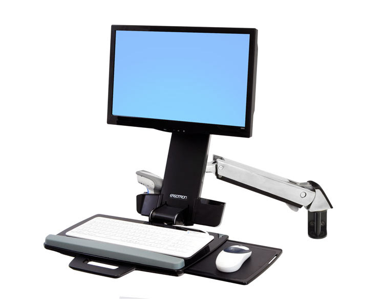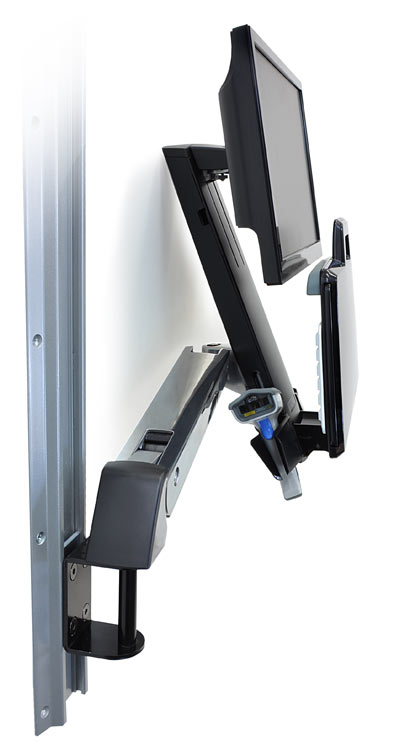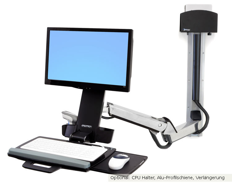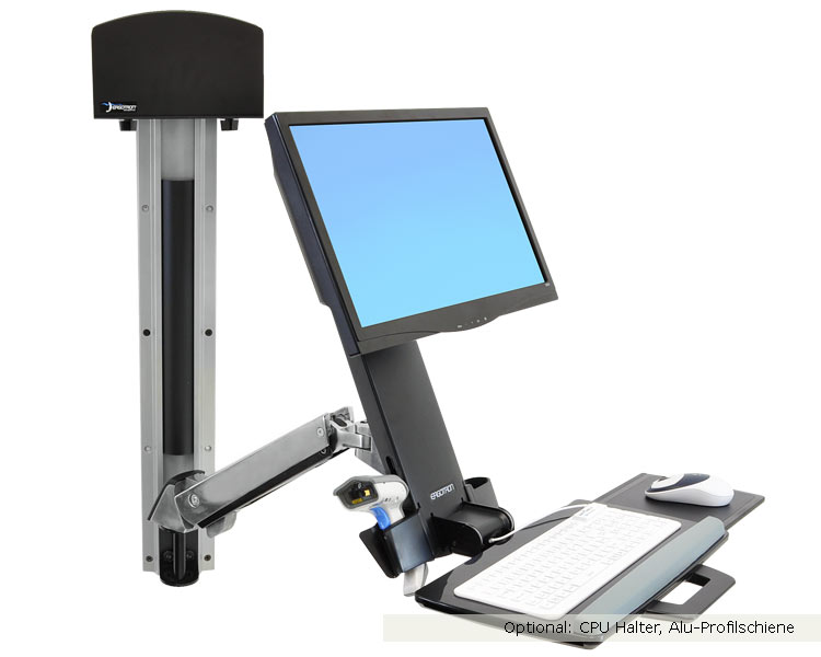 - Includes Combo Arm, wall mount bracket, track mount bracket kit, height-adjustable Monitorhalter, wrist rest, scanner and mouse holder, integrated keyboard tray with left/right mouse tray, handle, VESA monitor mounting kit, cable ties