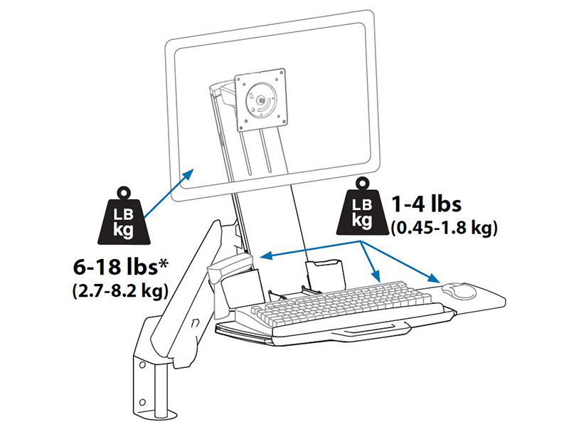 | Tragkraft: | display = 6- 18 lbs (2.7- 8.2 kg) or up to 25 lbs (11.4 kg) with tilt and lift lock-out features engaged; keyboard, mouse and barcode scanner = 4 lbs (1.8 kg) |