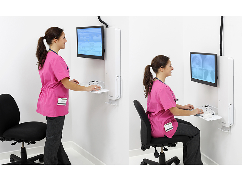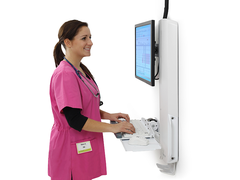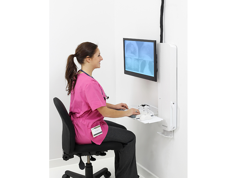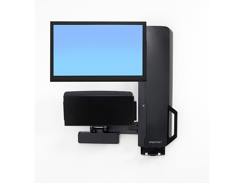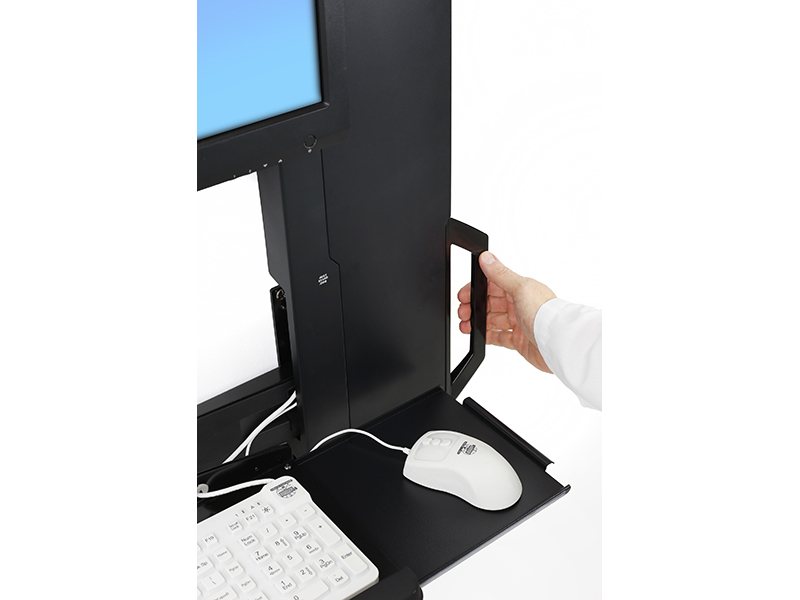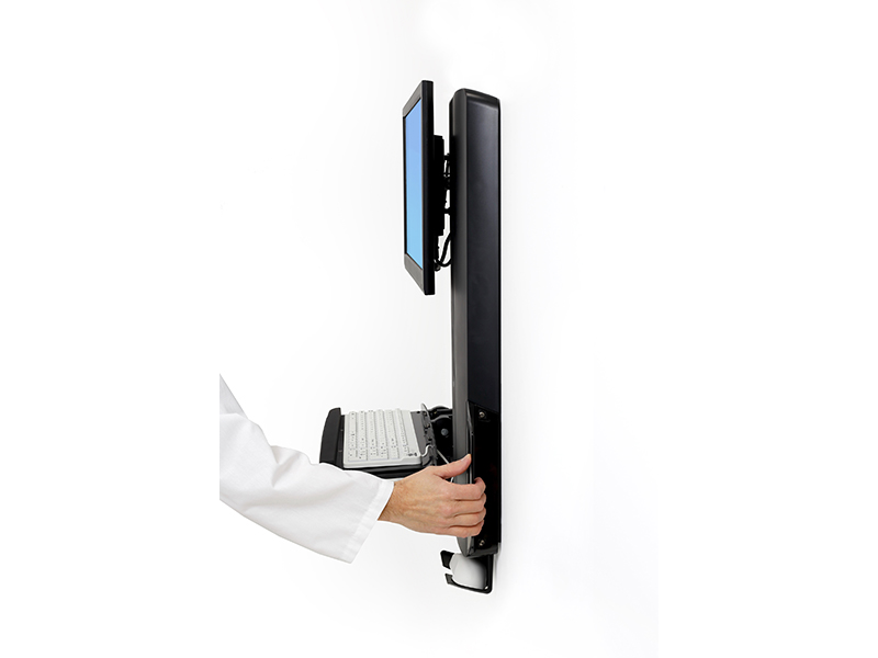 - Niedriges Profil erfüllt strikte Vorschriften und Normen in Bezug auf die Tiefe von Wandvorsprüngen, erleichtert die Compliance mit den Anforderungen der Joint Commission Tastaturablage mit automatischem Einzug gewährleistet eine minimale Tiefe, wenn das System nicht benutzt wird