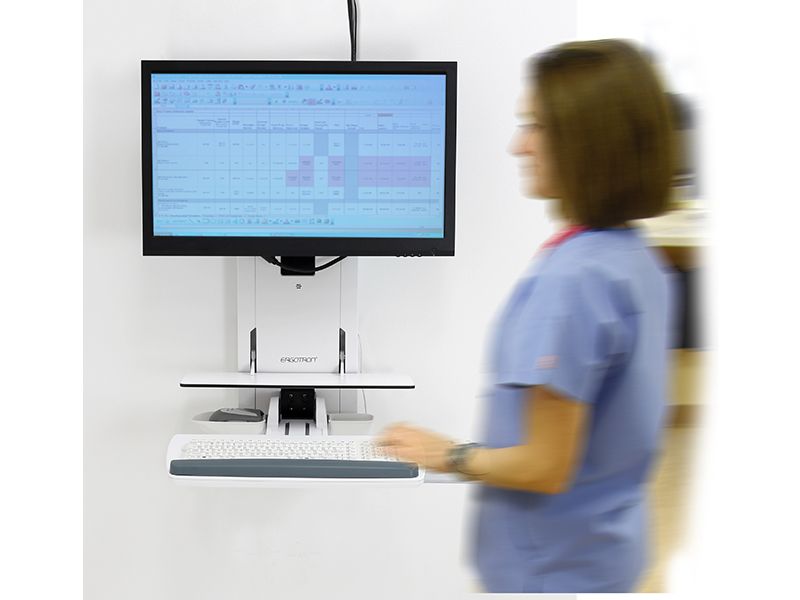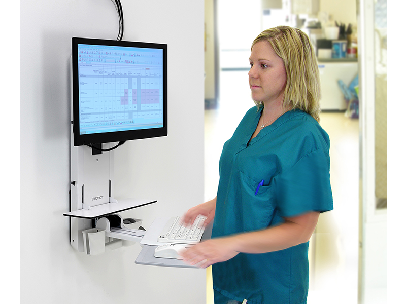 - Seitliche Schwenkbarkeit von Tastaturen und Monitoren fördert die Interaktion zwischen Patient und medizinischem Personal während des Datenzugriffs
