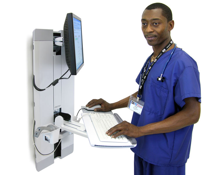 Die ausziehbare und negativ neigbare Tastaturablage sorgt für mehr Komfort, während die Schwenkfunktion für Monitor und Tastatur zu einer besseren Interaktion zwischen Patienten und medizinischem Personal beiträgt.