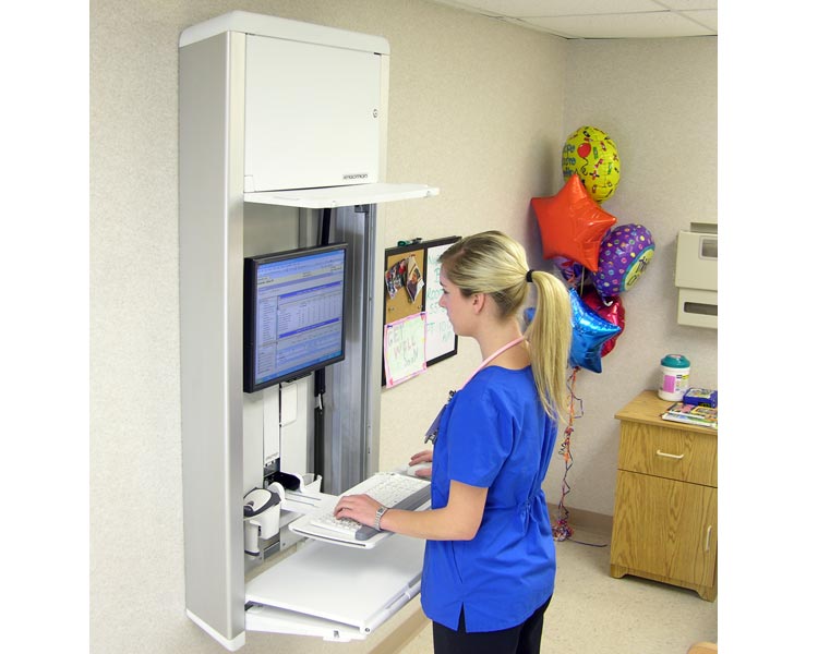Die ausziehbare und negativ neigbare Tastaturablage sorgt für mehr Komfort, während die Schwenkfunktion für Monitor und Tastatur zu einer besseren Interaktion zwischen Patienten und medizinischem Personal beiträgt. Ein einzigartiges Ergotron Kabelführungssystem verdeckt und ordnet die Kabel und erleichtert so die Reinigung.