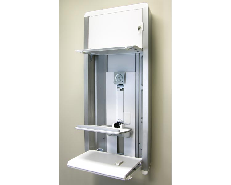 Durch den geringen Wandabstand und die vertikale Höhenverstellung um 23 cm ist das Produkt ideal für Patientenzimmer mit begrenzten Platzverhältnissen geeignet. Es lässt sich mühelos zu einer schlanken und kompakten Einheit zusammenklappen, wenn es nicht gebraucht wird. Durch den schlüsselfreien Sperrmechanismus werden vertrauliche Patientendaten geschützt und Datenschutzrichtlinien eingehalten.