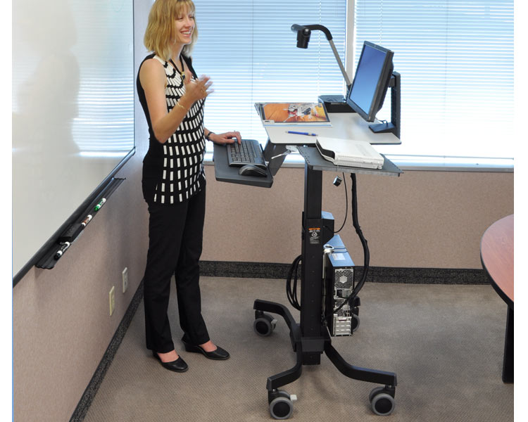 - Auf dem Computerwagen können Laptops, Monitor/CPUs, integrierte CPUs, tragbare Dokumentenkameras/Visualizer, DVD-Player und Wireless Extender aufgestellt werden.