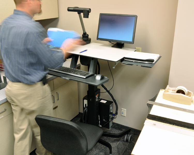 Auf dem kompakten und stabilen Ergotron TeachWell Steh-Sitz Arbeitsplatz können Notebook oder Monitor/CPU, Tastatur und Maus, tragbare Dokumentenkamera, DVD-Player, Beamer und vieles mehr untergebracht werden. Durch den Wegfall der Gebundenheit an Schreibtisch, Pult oder einen fixen Standort kann der Lehrende sich frei im Raum bewegen und einen kooperativen Unterricht fördern. Der Ergotron TeachWell Steh Sitz Tisch mit Ablage und Rollen lässt sich bequem durch Gänge, Türen und räumlich begrenzte Arbeitsbereiche rollen. Tastatur, Bildschirm und Arbeitsfläche lassen sich gleichzeitig in der Höhe verstellen. Wechseln Sie aus einer sitzenden in eine stehende Position, wann immer Sie wollen.