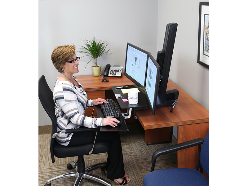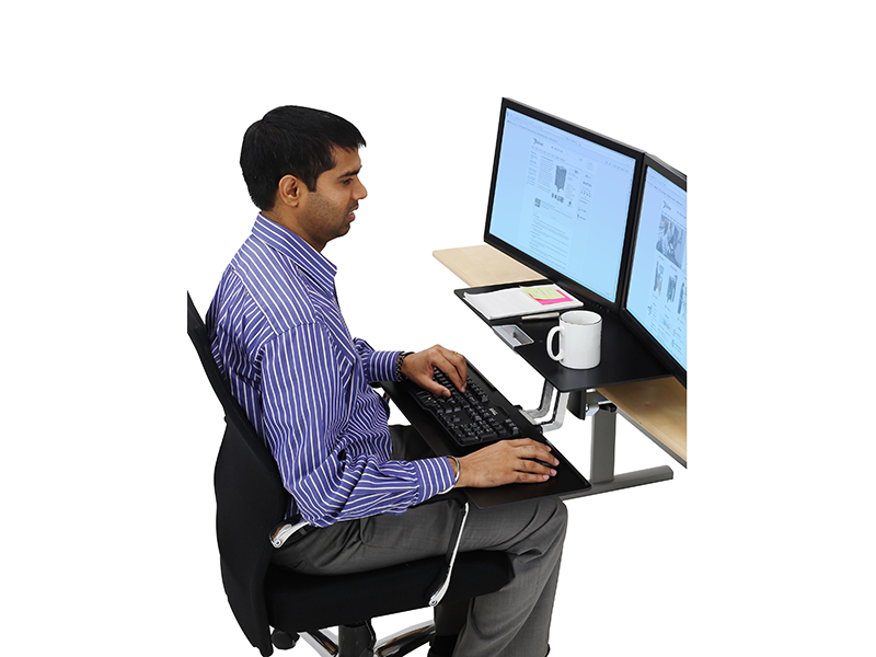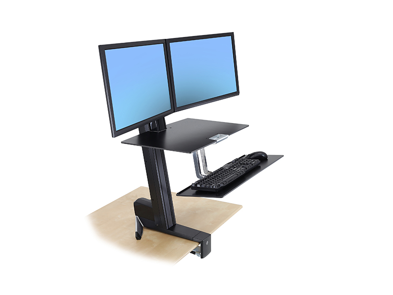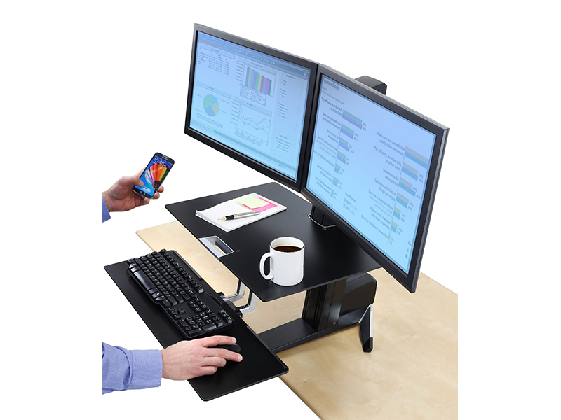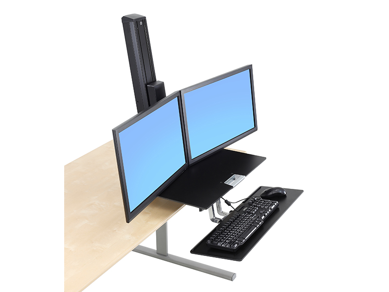 Aus der sitzenden in die stehende Haltung wechseln, wann immer Sie möchten. Mit der Ergotron WorkFit-S Dual mit Worksurface, schwarz (33-349-200) lassen sich Tastatur und Display gleichzeitig in der Höhe verstellen, wodurch komfortables Arbeiten am Computer auch über längere Zeiträume hinweg ermöglicht wird.