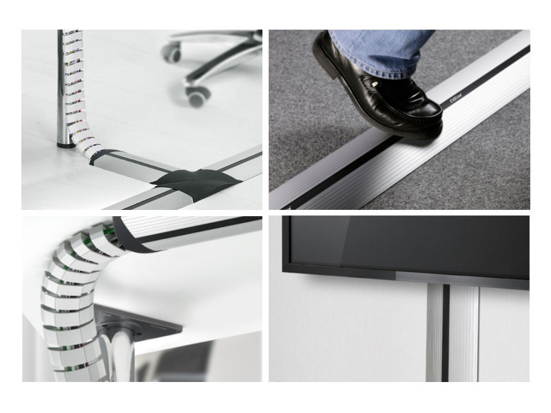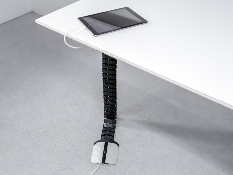 Sorgt für eine aufgeräumte Arbeitsfläche auf dem Tisch ohne Kabelsalat: der besonders flexible EVOline WireLane Kabelkanal führt und ordnet die Kabel unter dem Tisch und lässt sich mit der EVOline Aluminium Kabelbrücke verbinden.