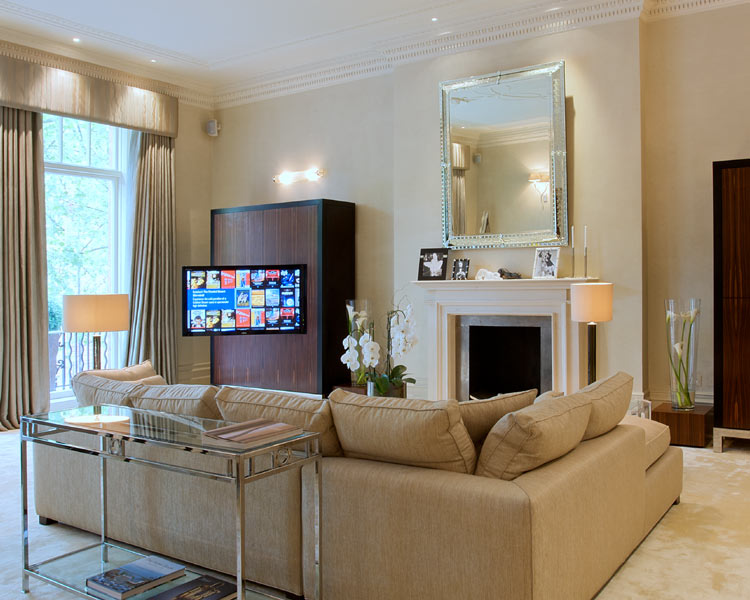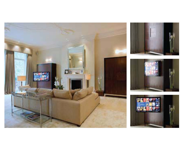 Das Display kann aus der Wand herausbewegt und um 45 Grad in beiden Richtungen gedreht werden, um eine optimale Ausrichtung auf Ihren Lieblingssitzplatz zu gewährleisten. Eine einzigartige Kontruktion, die ultimative Funktionalität, Ästhetik und maximalen "AHA-Effekt" miteinander kombiniert. Verfügbar in einer Vielzahl an Ausführungen, erlaubt dieser Mechanismus Ihrem Innenarchitekten maximale Kreativität und Freiheit bei der Gestaltung Ihrer Wohnzimmerwand.