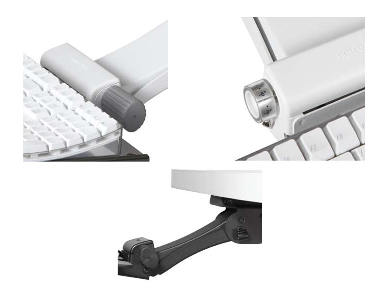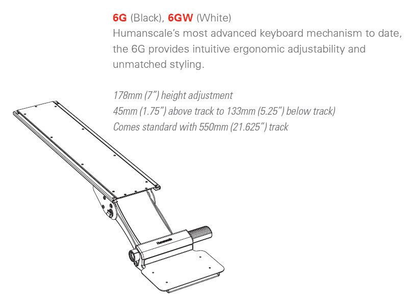 Eine Schlüsselkomponente eines ergonomischen Arbeitsplatzes, ist eine verstell- und ausziehbare Tastaturhalterung in gutem Design, die mit Bürostuhl und Monitorarm zusammenarbeitet, um eine gesunde und komfortable Haltung zu ermöglichen. Humanscale 6G Tastaturen bringen im wahrsten Sinne des Wortes die Arbeit so zu Ihnen, dass ein Zurücklehnen im Stuhl ermöglicht wird und so die Gefahr von ernsten Erkrankungen, wie Karpaltunnelsyndrom, Schulter- und Rückenschmerzen, oder anderen Beeinträchtigungen des Bewegungsapparates verringert wird.