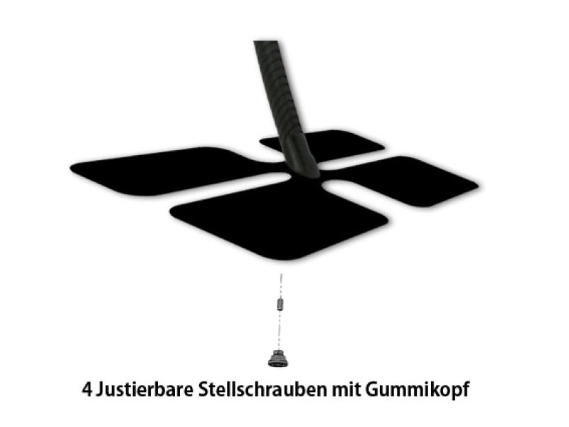 Im Lieferumfang enthalten sind 4 verstellbare Schrauben mit Gummikopf unter der Bodenplatte zum Justieren auch bei unebener Fläche.