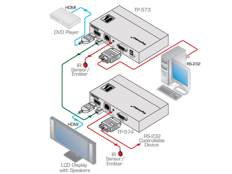 Die Modelle Kramer TP-573 und Kramer TP-574 sind Twisted Pair Übertrager und Empfänger für HDMI, RS−232 und Infrarot−Signale. Der Kramer TP-573 wandelt ein HDMI, RS−232 und Infrarot−Signal in ein Twisted Pair Signal, der Kramer TP-574 wandelt das Signal zurück in die ursprünglichen HDMI, RS−232 und Infrarot−Signale