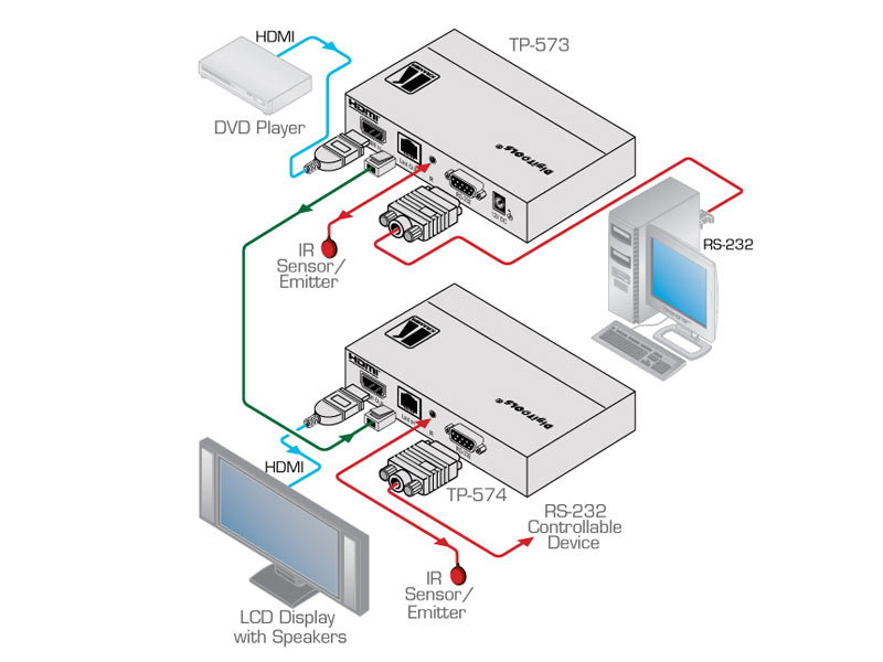 Die Modelle Kramer TP−573 und Kramer TP−574 sind Twisted Pair Übertrager und Empfänger für HDMI, RS−232 und Infrarot−Signale. Der TP−573 wandelt ein HDMI, RS−232 und Infrarot−Signal in ein Twisted Pair Signal, der Kramer TP−574 wandelt das Signal zurück in die ursprünglichen HDMI, RS−232 und Infrarot−Signale.