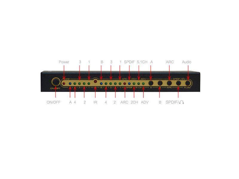 Der Clou an diesem Switch ist der integrierte Audioausgang. Sie können das Audiosignal direkt am Switch abgreifen und z.B. einer Heimanlage zuführen. Zu diesem Zweck sind sowohl ein optischer SPDIF-Ausgang als auch eine 3,5 mm-Klinkenbuchse vorgesehen. Es werden verschiedene Audioformate unterstützt. Über den optischen Ausgang kann Dolby 5.1 Audio ausgegeben werden. Über den 3,5 mm-Ausgang ist auch die Ausgabe eines analogen Stereosignals möglich. Da der Leicke Switch über ARC (Audio-Rückkanal) verfügt, kann das Audiosignal vom LCD-TV oder Beamer auch zurückgeleitet werden. Die Auskopplung von Audio ist nur von Videosignalen, die über Ausgang A abgespielt werden, möglich.
