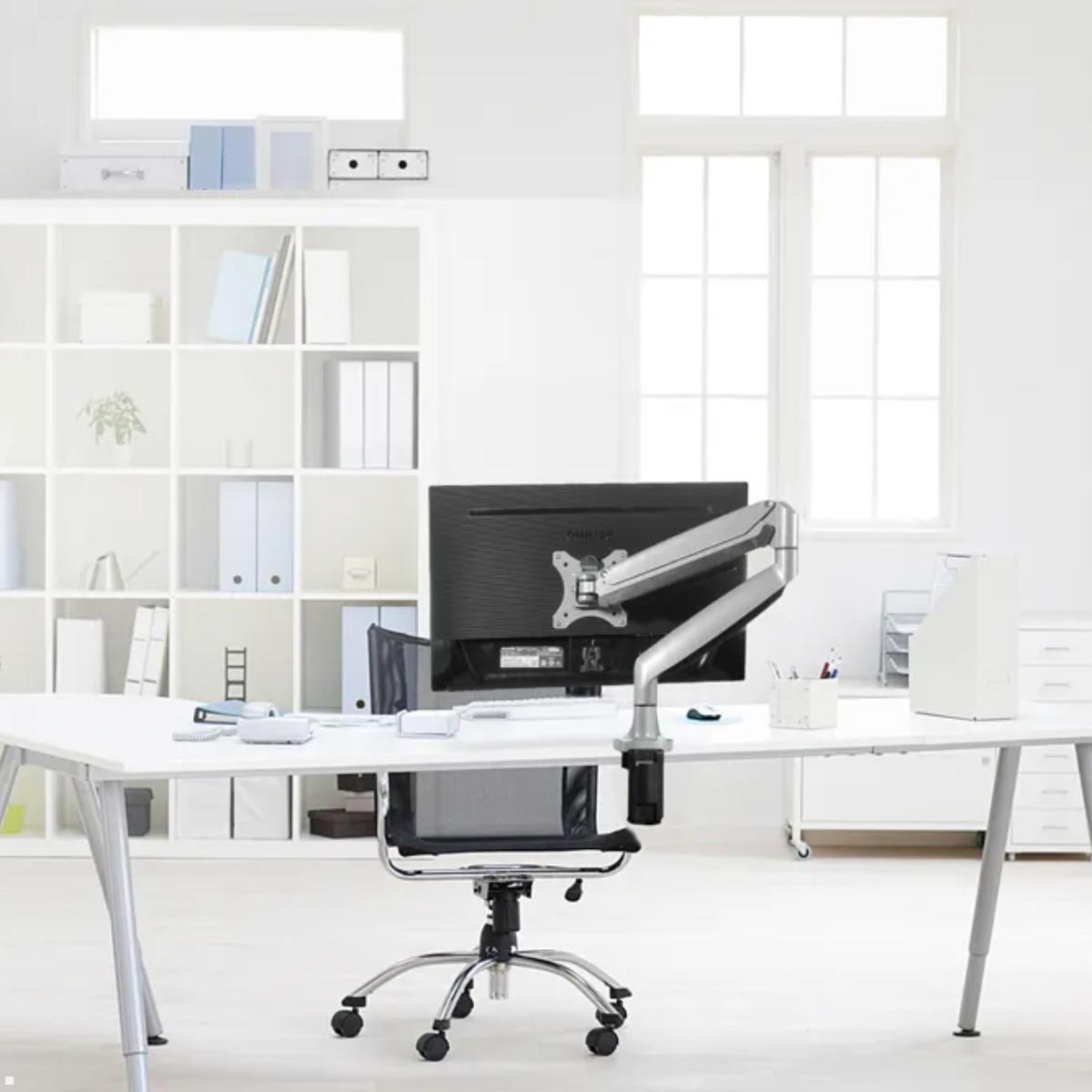 Die Neige-, Schwenk- und Drehfunktion der flexiblen Display Halterung in silber mit drei Drehpunkten ermöglicht es, verschiedene Betrachtungswinkel einzustellen. Dadurch können Nacken- und Rückenschmerzen langfristig vermieden werden. Perfekt eignet sich die Monitorhalterung für Büros, Rezeptionen in Hotels, für Orte mit einem hohen Personenaufkommen, in denen Monitore zur Präsentation von Inhalten benötigt werden, sowie im privaten Bereich im Home-Office.