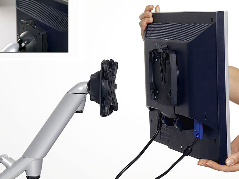 Einfache Monitoranbringung dank QuickRelease mit Einhebelbedienung. Kugelkopfgelenk zur Einstellung des optimalen Betrachtungswinkels sowie zur Ausnutzung der Pivotfunktion von Monitoren.