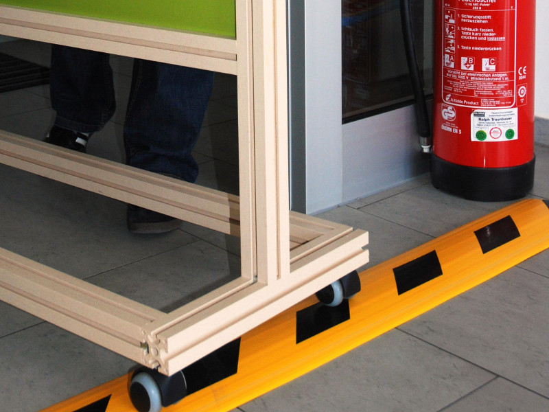 - Kabelbrücken liegen sicher ohne Fixierung auf: Asphalt, Beton, Fliesen, Parkett Linoleum, Teppich und Teppichboden