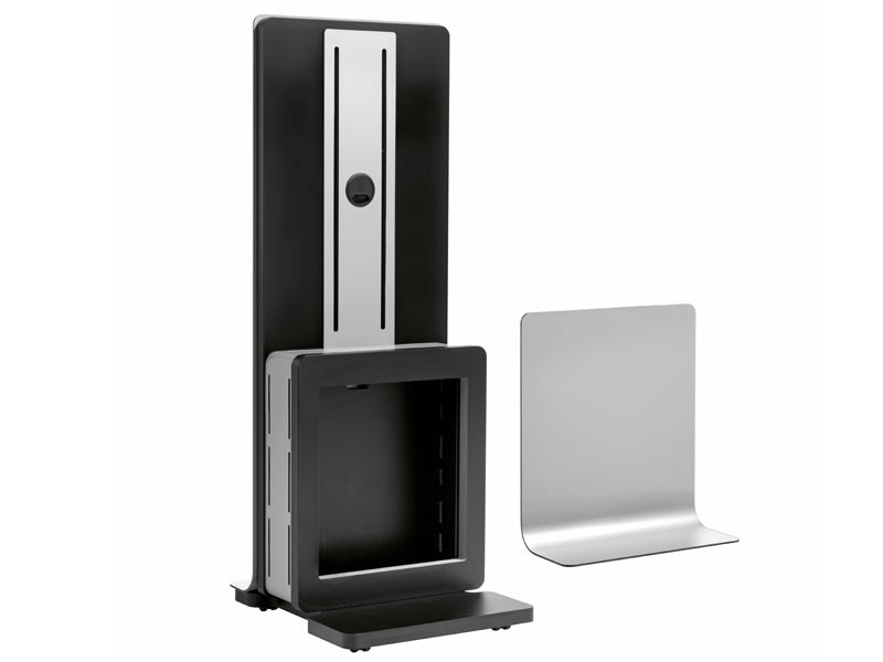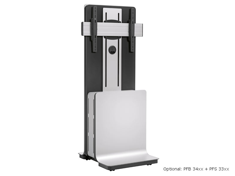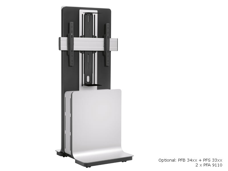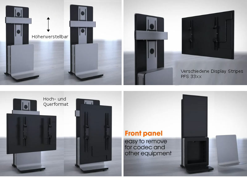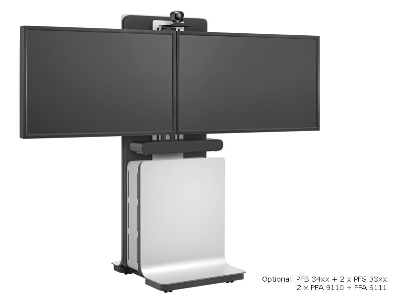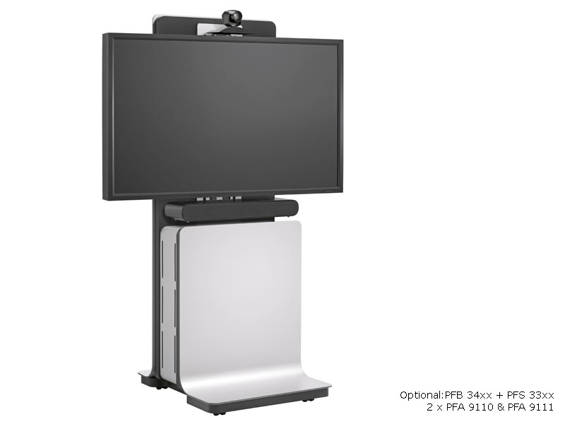 Um ein oder zwei Bildschirme zu befestigen, können Sie die Connect-it Adapterstange und Streifen von Vogel's verwenden. Zum Anbringen einer Videokonferenzkamera oder eines Lautsprechers kann ein Spezialhalter (PFA 9110) verwendet werden. Die Aluminiumverkleidung an der Vorderseite kann ganz einfach entfernt werden. So ist der Zugriff auf das Innere möglich, wo ein Codec und andere Peripheriegeräte aufbewahrt werden können. Neben Videokonferenzen ist dieses Möbel auch ideal für die Verwendung als Kiosk mit einem Bildschirm im Hochformat oder als Luxus-Bildschirmstandfuß, in dem die Peripheriegeräte untergebracht werden können.
