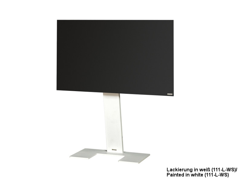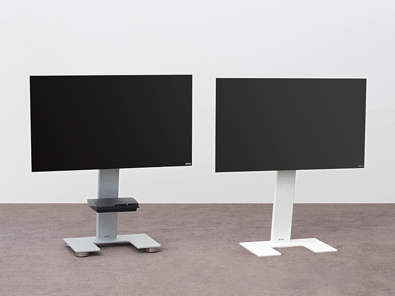 Weniger ist mehr: Der minimalistische Wissmann TV Ständer omega art111-E-1 mit eckigem Sockel als Standversion mit klarer Formensprache. Auf Wunsch mit unsichtbaren Rollen. Unsichtbare Kabelführung innerhalb der senkrechten Säule. Höhe Bildmitte ca. 100 cm.