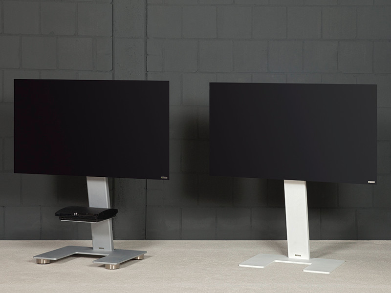 Weniger ist mehr: Der minimalistische Wissmann TV Standfuß omega art111-E-1S für 40 - 55 Zoll Flatscreens mit eckigem Sockel in silbergrau als Standversion mit klarer Formensprache.