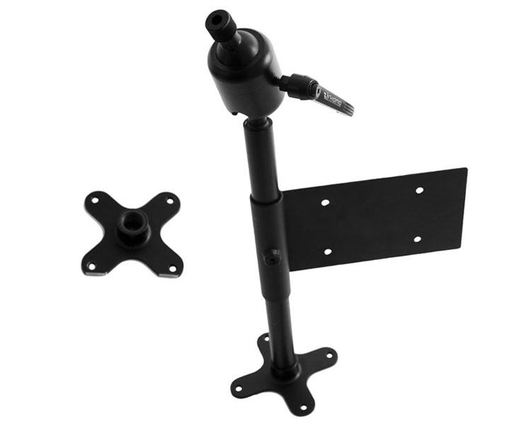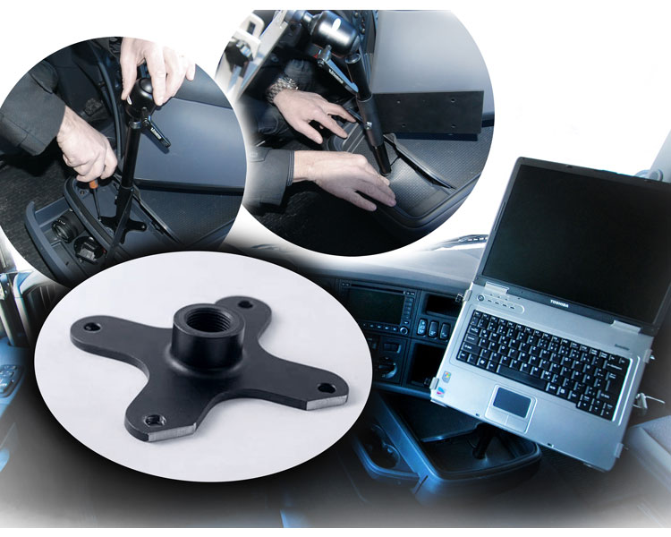 - Das PC-Stativ wird an die Mittelkonsole mit durchgehender Schraube sowie mit einer Stützplatte an die Seite des Armaturenbretts montiert.